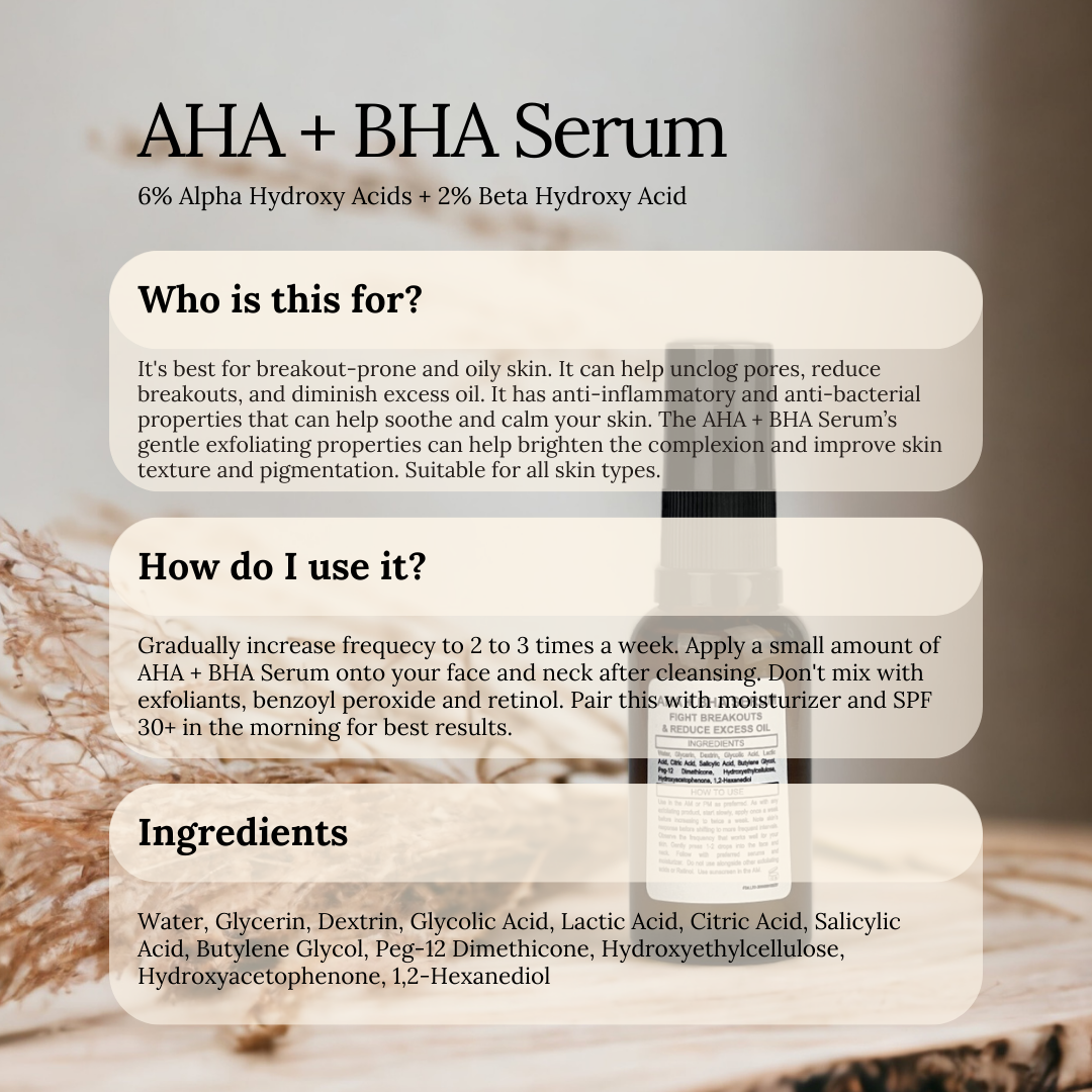 🤲🏼 How To Use: Apply a small amount of AHA + BHA Serum onto your face and neck after cleansing. Massage in circular motions until fully absorbed. It is gentle and is a non irritating way to exfoliate the skin. Start Slowly: Apply 1x a week and may be increased to 2 times a week. This is a leave on product, no need to rinse. Note skin's response before shifting to more frequent intervals. Observe the frequency that works well for your skin