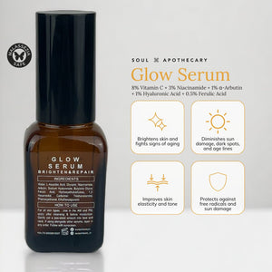 Get healthy-looking skin and defy signs of aging with Soul Apothecary's Glow Serum. Packed with five powerhouse ingredients, this premium serum brightens your skin, fights free radicals, and diminishes sun damage, dark spots, and age lines. Experience the benefits of essential vitamins and antioxidants and protect your skin against free radicals and sun damage.