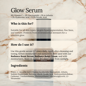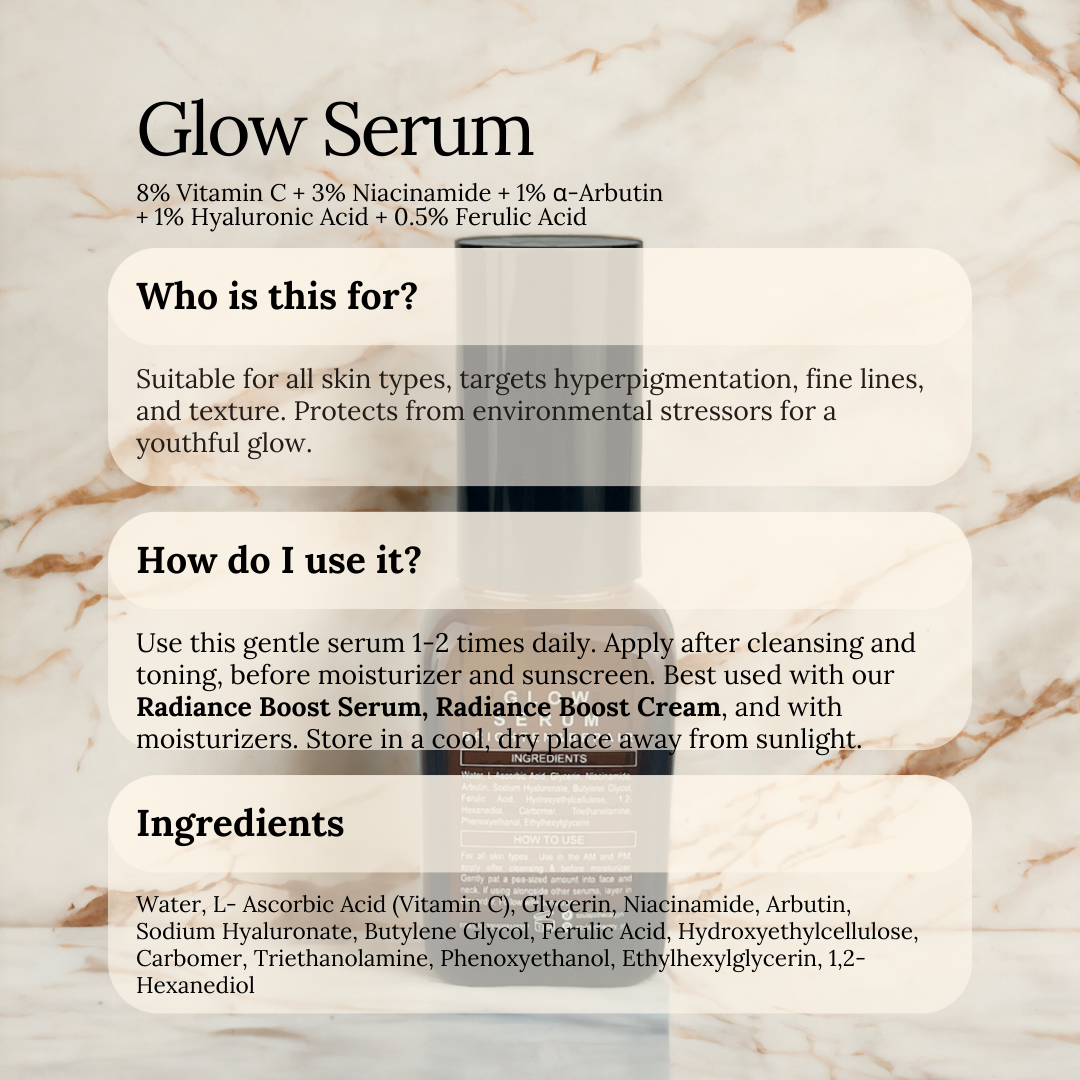 🧑🏻 Who Should Use It: The Glow Serum is suitable for all skin types, especially for those who are looking to brighten their complexion, address hyperpigmentation, reduce the appearance of fine lines and wrinkles, and improve the overall texture of their skin. This serum is ideal for individuals who want to protect their skin from environmental stressors and free radicals while promoting a more youthful, radiant glow.