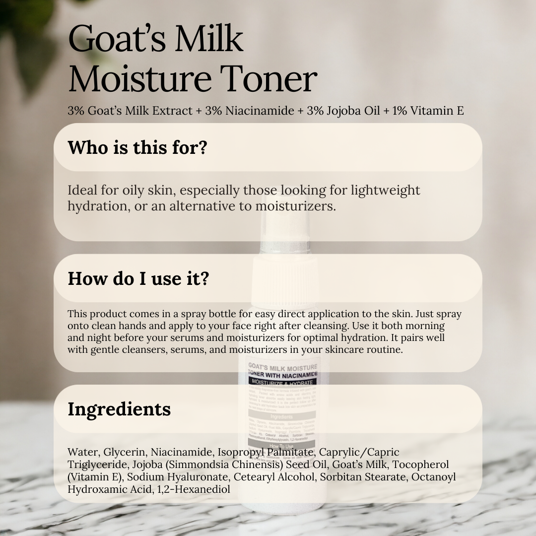 💧Ingredients: Water, Glycerin, Niacinamide, Isopropyl Palmitate, Caprylic/Capric Triglyceride, Jojoba (Simmondsia Chinensis) Seed Oil, Goat’s Milk, Tocopherol (Vitamin E), Sodium Hyaluronate, Cetearyl Alcohol, Sorbitan Stearate, Octanoyl Hydroxamic Acid, 1,2-Hexanediol