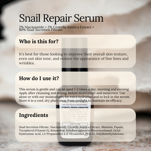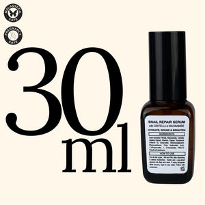 Get ready to glow with our Snail Repair Serum! This powerful serum combines the hydrating and healing properties of snail mucin and centella asiatica with the brightening abilities of niacinamide. The result? Smoother, brighter, and healthier-looking skin. Say goodbye to dryness, blemishes, and fine lines, and hello to a lit-from-within glow. Plus, it's cruelty-free, so you can feel good about your purchase.