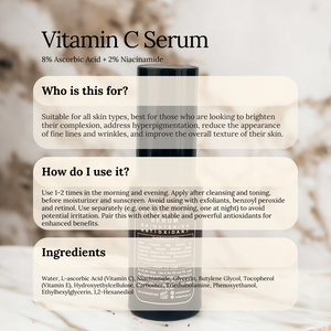 🧑🏻 Who Should Use It: The Vitamin C Brightening Serum is suitable for all skin types, especially for those who are looking to brighten their complexion, address hyperpigmentation, reduce the appearance of fine lines and wrinkles, and improve the overall texture of their skin. This serum is ideal for individuals who want to protect their skin from environmental stressors and free radicals while promoting a more youthful, radiant glow.